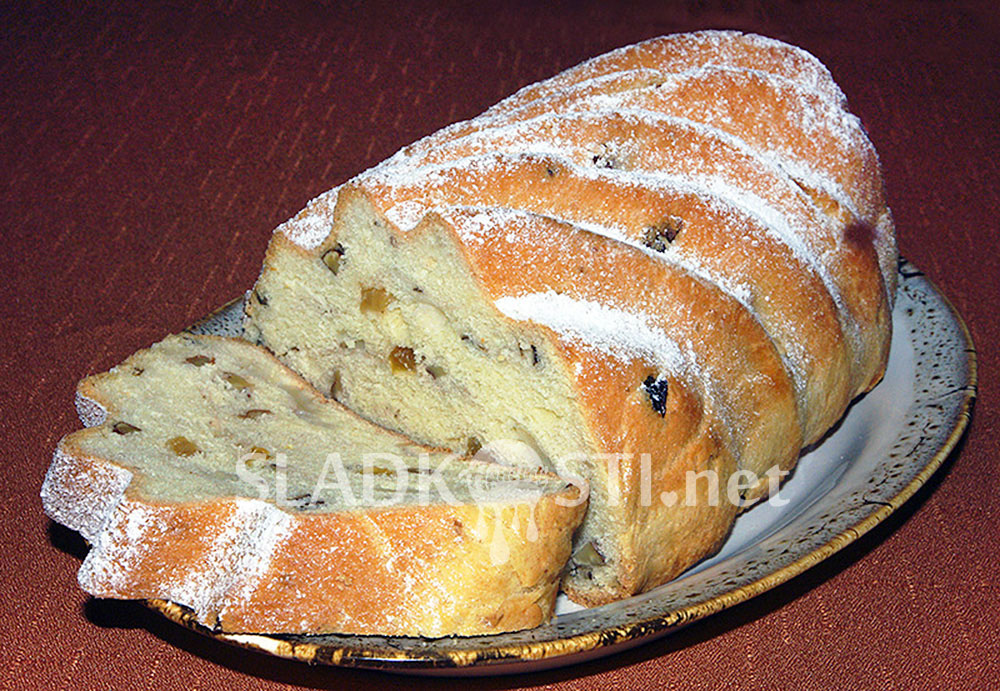 Do mísy prosejeme mouku, uprostřed uděláme důlek a necháme v něm vzejít kvásek. Žloutky rozšleháme s mlékem, solí a moučkovým i vanilkovým cukrem. Směs mírně nahřejeme, a jakmile vzejde kvásek, přilijeme ji do mísy. Přidáme kardamom, citrónovou kůru a rozpuštěné teplé máslo a vypracujeme měkké těsto. Mísu přikryjeme utěrkou a necháme těsto vykynout. Mezitím pokrájíme ořechy a posekáme rozinky. Jakmile těsto vykyne, oloupeme jablka, vykrájíme je a nakrájíme na malé kousky. Do vykynutého těsta pak na pomoučněném válu zapracujeme připravenou náplň, vyválíme šišku, přeneseme ji do tukem vymazané formy a necháme ještě asi 20 minut kynout. Potom vložíme formu s těstem do trouby vyhřáté na 180°C a pečeme po dobu 60 minut. Asi po 15 minutách teplotu snížíme na 150-160°C. Jakmile těsto na povrchu zrůžoví, přikryjeme formu alobalem. Upečený chlebíček (zkusíme špejlí) překlopíme na kuchyňskou mřížku a poprášíme moučkovým cukrem. Krájíme až po úplném vychladnutí.