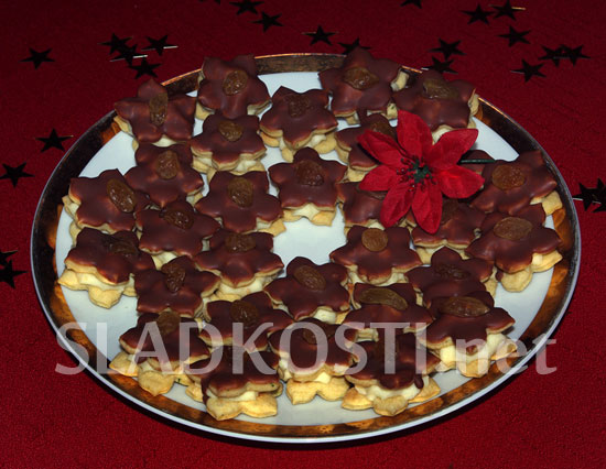 Z uvedených surovin vypracujeme na válu měkké těsto, zabalíme je do fólie a necháme v chladničce 2 hodiny odležet. Potom těsto rozválíme na sílu 2-3 mm, vykrájíme kytičky, rozložíme je na plech s papírem na pečení a pečeme v troubě vyhřáté na 180°C po dobu 8 minut. Upečené zchladlé kytičky slepíme po dvou hvězdičkou krému a uložíme je asi na hodinu do chladničky. Vychlazené pak svrchu máčíme v rozpuštěné mléčné čokoládě a zdobíme rozinkou.