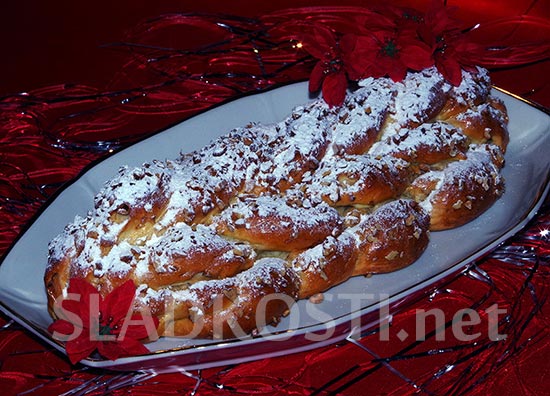 Z droždí necháme vzejít kvásek. Do mísy kuchyňského robotu prosejeme obě mouky, promícháme je s moučkovým cukrem, doprostřed uděláme důlek, nalijeme do něj vlažné mléko s rozšlehaným vanilkovým cukrem, solí a žloutky a přidáme kvásek. Přidáme rozpuštěné teplé máslo, vypracujeme tužší těsto a necháme je vykynout. Vykynuté těsto pak vyklopíme na vál, propracujeme rukama a rozdělíme je na třetiny. (Z jedné třetiny jsem upekla štolu.) Do druhé části těsta vpracujeme sekané ořechy a citrónovou kůru. Těsto rozdělíme na devět dílů (čtyři větší, tři o trochu menší a dva ještě menší), vyválíme z nich válečky a upleteme klasickou vánočku. Přeneseme ji na plech vyložený papírem na pečení a necháme nakynout. Potom vánočku potřeme rozšlehaným vejcem, posypeme sekanými ořechy a pečeme v troubě vyhřáté na 180°C po dobu 10 minut, teplotu zmírníme na 150°C a ještě asi 30 minut dopékáme. Ke konci pečení přikryjeme vánočku pečícím papírem, aby povrch příliš neztmavnul. Upečenou zchladlou vánočku posypeme směsí moučkového a vanilkového cukru a po úplném vychladnutí ji nakrájíme.