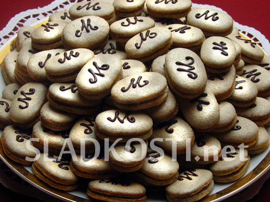 Z uvedených surovin vypracujeme na válu těsto a necháme je v chladnu odpočinout. Těsto pak rozválíme na sílu 2-3 mm, vykrájíme malé oválky a pečeme je na plechu vyloženém papírem na pečení při 180°C asi 10 minut dorůžova. Zchladlé oválky slepujeme po dvou kávovým krémem a poléváme kávovou polevou. Na zaschlou polevu pak napíšeme pomocí cukrářského pytlíku rozpuštěnou čokoládou písmeno „M“.