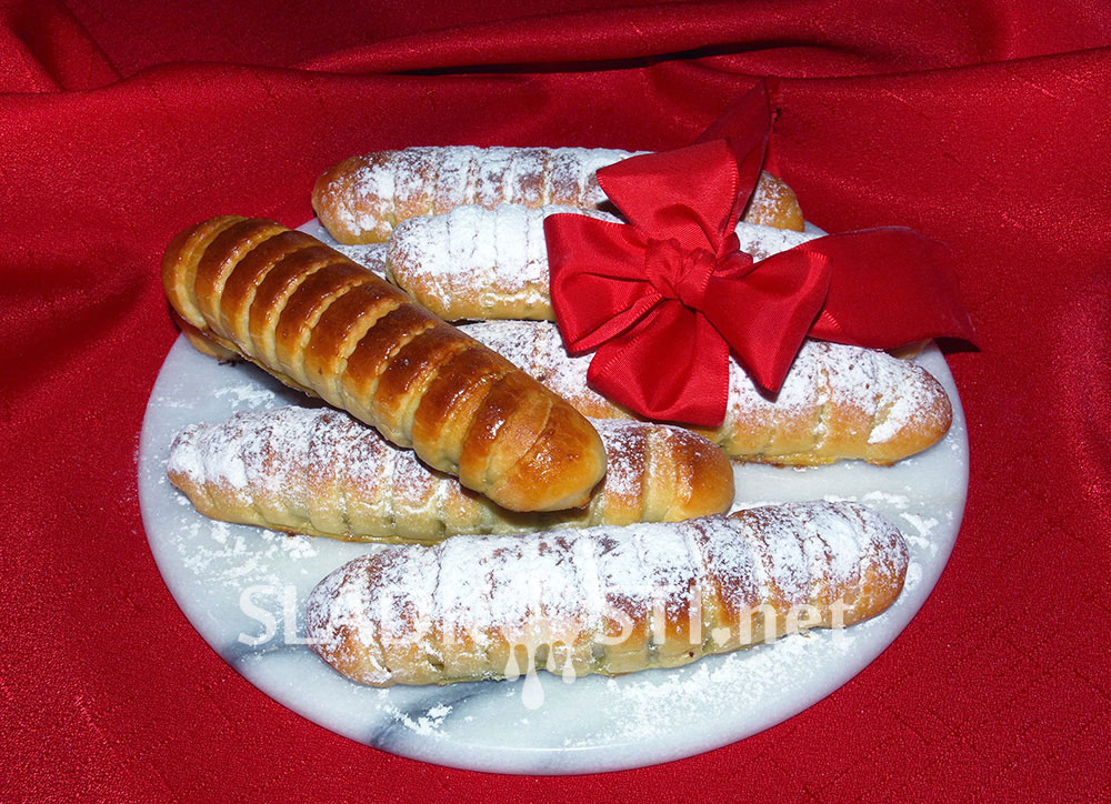 Z droždí, trošky vlažného mléka, lžíce moučkového cukru a dvou lžic mouky necháme vzejít kvásek. Ve 150 ml vlažného mléka rozšleháme žloutky, sůl a krupicový i vanilkový cukr. Obě mouky prosejeme do mísy, přilijeme vlažnou tekutou směs a vlažné máslo a přidáme citrónovou kůru a kvásek. Vypracujeme měkké těsto, poprášíme je moukou, mísu přikryjeme utěrkou a těsto necháme na teplém místě vykynout. Nugát najemno nastrouháme a promícháme se skořicí. Vykynuté těsto rozdělíme na několik dílů (vyšlo mi 13 po 65 g), na pomoučněném válu z nich vytvoříme bochánky a necháme je pod utěrkou asi půl hodiny kynout. Bochánky pak postupně rozválíme na obdélníkové placky a každou z nich do poloviny posypeme asi dvěma lžičkami směsi nugátu se skořicí. Volné těsto několikrát nařízneme rádlem, ale tak, aby zůstalo spojené.  Pevně svineme rolky, oba konce důkladně utěsníme a přeneseme je na plech vyložený papírem na pečení. Rolky necháme ještě chvíli kynout a pak je potřeme rozšlehaným vejcem. Pečeme v troubě vyhřáté na 200°C po dobu 20-25 minut dočervena. Upečené zchladlé rolky pocukrujeme.