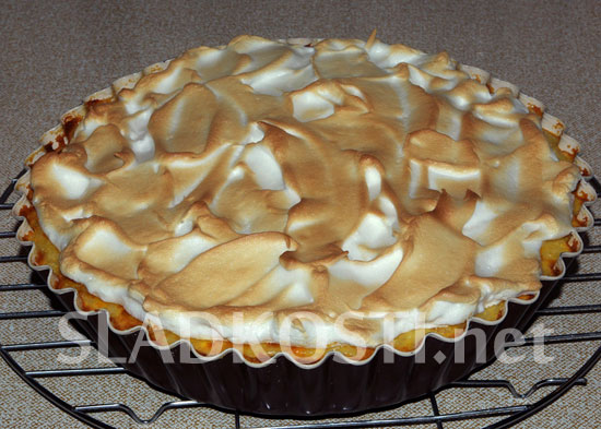 Zapékáme při 200°C po dobu asi 25 minut. Ze 2 bílků a špetky soli ušleháme pevný sníh, zašleháme do něj krupicový cukr a sníh rozetřeme na upečený pudink. Formu vrátíme do trouby a necháme sníh zezlátnout.
