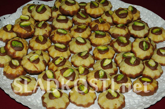Vypracujeme těsto, necháme je asi 2 hodiny v chladnu odpočinout, rozválíme na sílu 3 mm, vykrájíme kolečka a vložíme je do suchých formiček na košíčky. Pečeme při 170°C po dobu 10-12 minut. Upečené zchladlé bábovičky potřeme na spodní straně marmeládou (vyplníme důlek), namočíme do rozpuštěné mléčné čokolády smíchané s tukem a na mřížce necháme okapat a ztuhnout. Potom bábovičky obrátíme, nahoru kápneme trošku čokolády a do ní položíme půlku pistáciového oříšku.