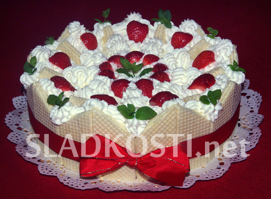 Z bílků a špetky soli ušleháme pevný sníh, postupně do něj zašleháme krupicový cukr, potom po částech přidáme a vmícháme prosátou hladkou mouku, olej a rum. Polotekuté těsto rozetřeme do připravené dortové formy a pečeme v troubě vyhřáté na 160°C po dobu asi 20 minut. Upečený korpus necháme chvíli stát ve formě, potom jej překlopíme na kuchyňskou mřížku a necháme zchladnout. Mezitím si připravíme krém. Ušleháme tvaroh se zakysanou smetanou a vanilkovým cukrem ze všech balíčků a vmícháme dotuha ušlehanou smetanu. Dortovou formu vyložíme potravinovou fólií, vložíme do ní vychladlý korpus, postříkáme jej rumem a potřeme jahodovým džemem. Z tvarohového krému dáme 2-3 lžíce stranou a polovinu z větší části rozetřeme na korpus. Tvarohový krém pak hustě poklademe celými očištěnými jahodami, překryjeme je zbytkem krému a formu s korpusem uložíme alespoň na 24 hodiny do chladničky. Druhý den potřeme bok dortu odloženým krémem a obložíme citrónovými oplatky. Nakonec dort ozdobíme dotuha ušlehanou smetanou, jahodami a mátovými lístky.
